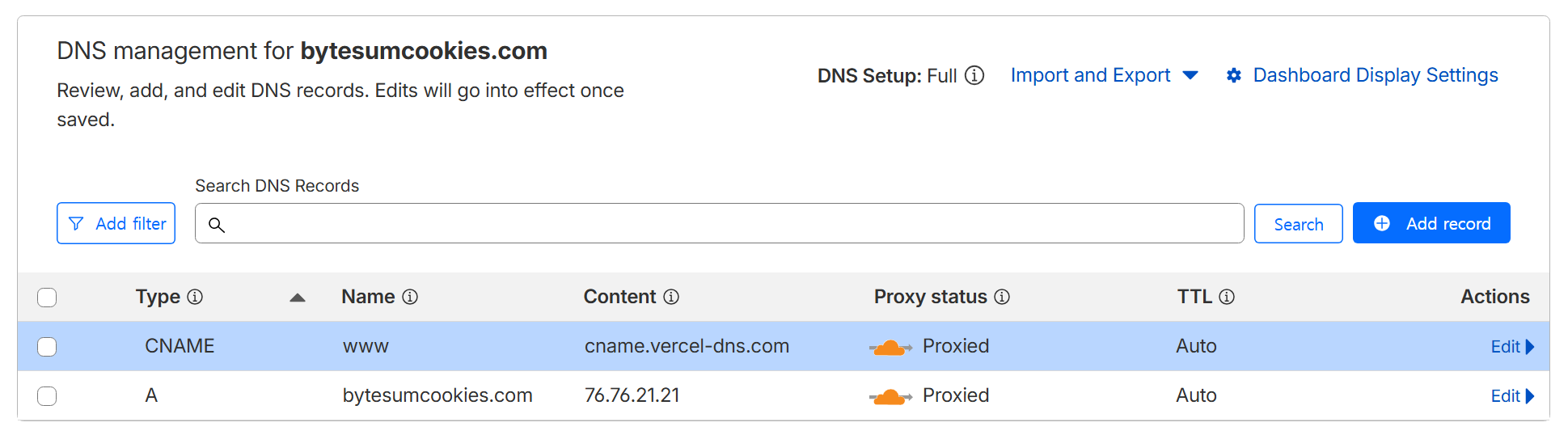 Vercel이 안내한 값대로 Cloudflare DNS에 레코드를 넣었다.